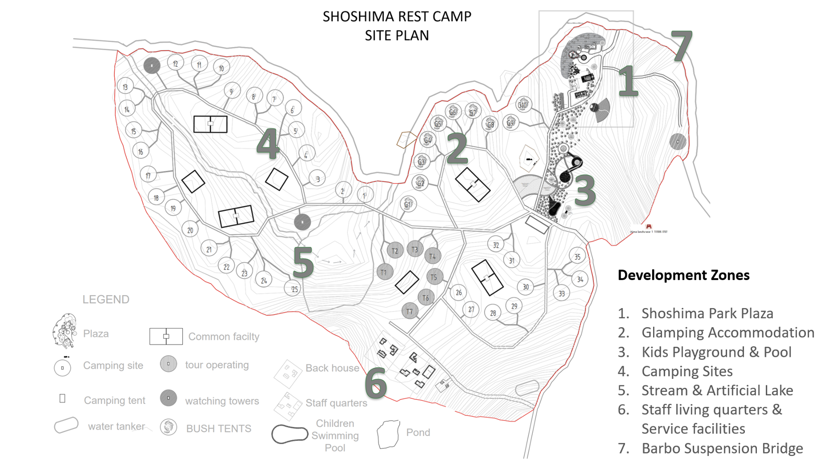 Five fully furnished luxury glamping safari tent units will sleep two and five family units will sleep four. Glamping clients can barbeque on the deck while watching river wildlife or cook in a communal kitchen. Camp sites will feature private sites and small clusters for couples, families and groups. Each will have built-in barbeque facilities, running water and communal kitchens and restrooms. Eight sites will be for tour operators with their clients, who could rent camping kit from the Shoshima Plaza.